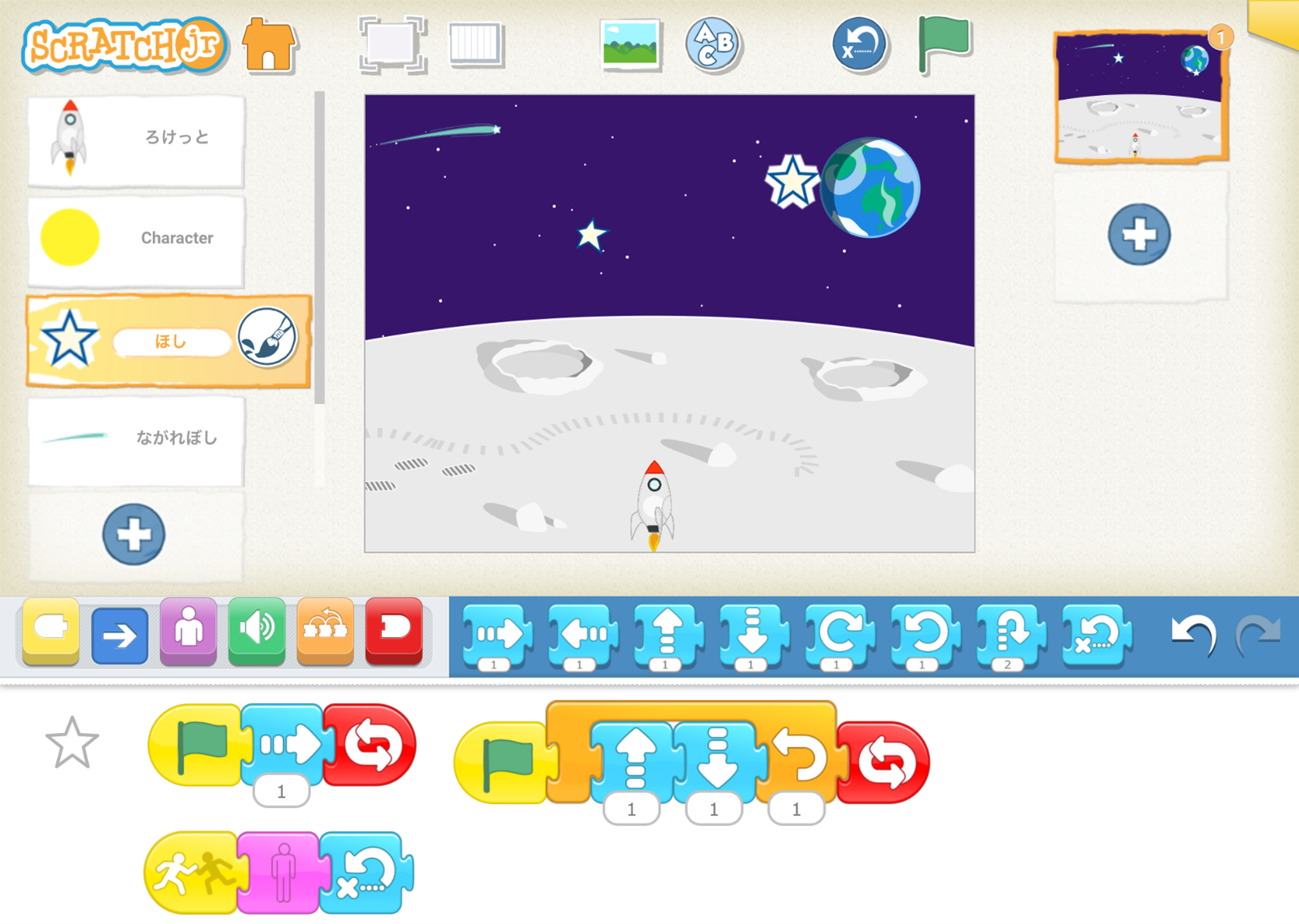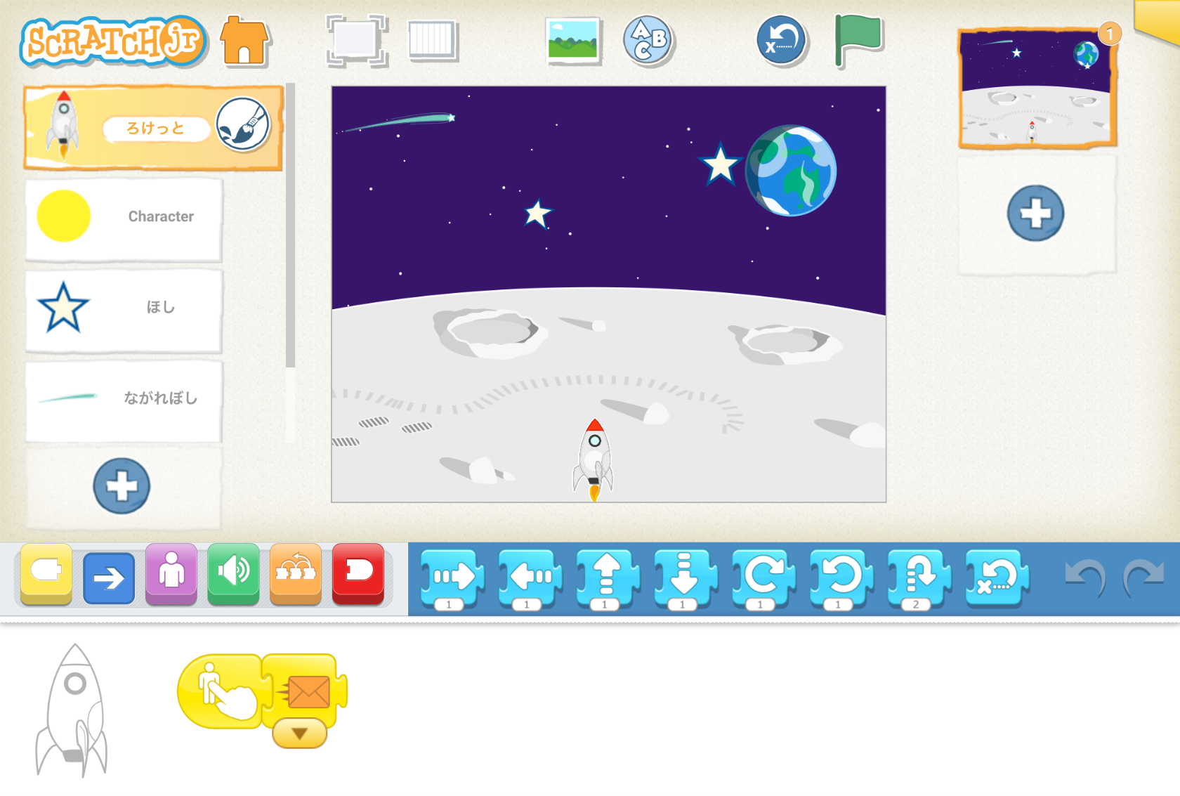 Scratch Jrはより簡単に取り組めるようになっており、ブロックに書かれる内容は言葉ではなく「➡」「💬」などの記号やイラストになっています。さらにタブレットで取り組むため、パソコンの操作に慣れていなくても挑戦が可能です。Scratchに比べるとできることは限られてしまいますが、ブロックの組み合わせ方次第ではシューティングゲームなどを作ることもできます。