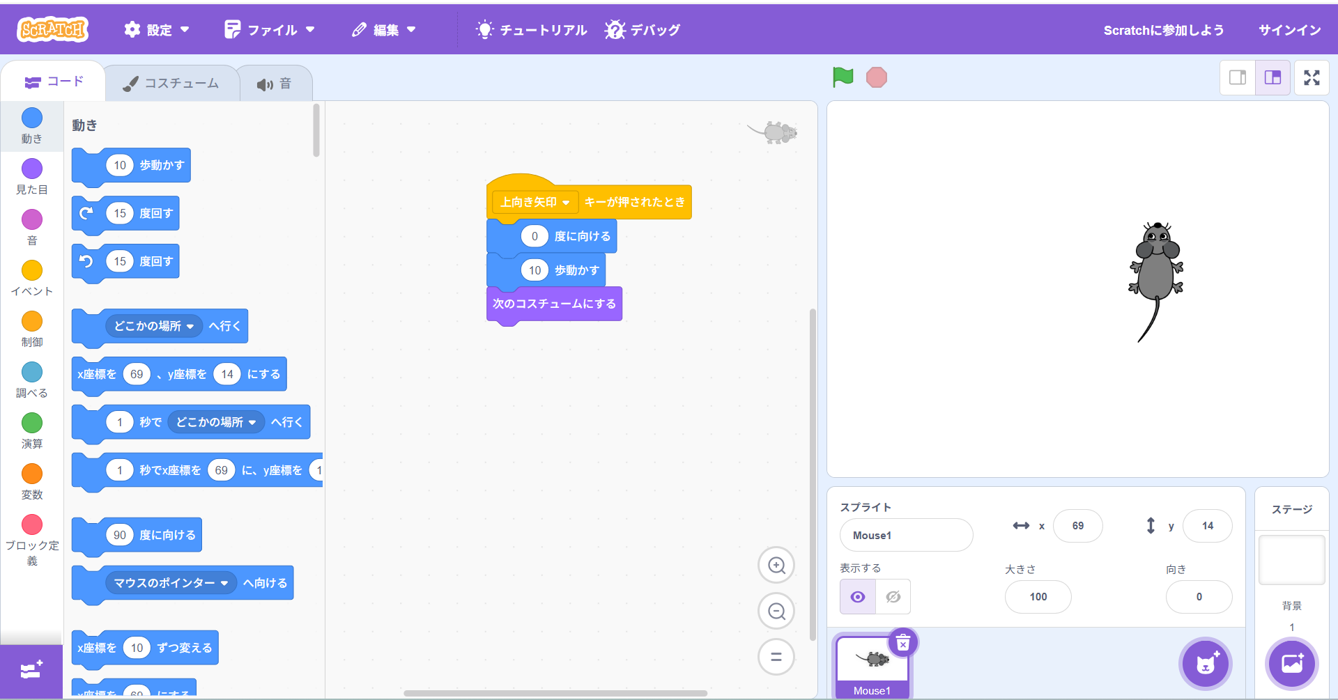 キーボードの上下左右のキーを押すと、ネズミがその方向に動くプログラミングを作る時、このようなブロックを組むことになります。