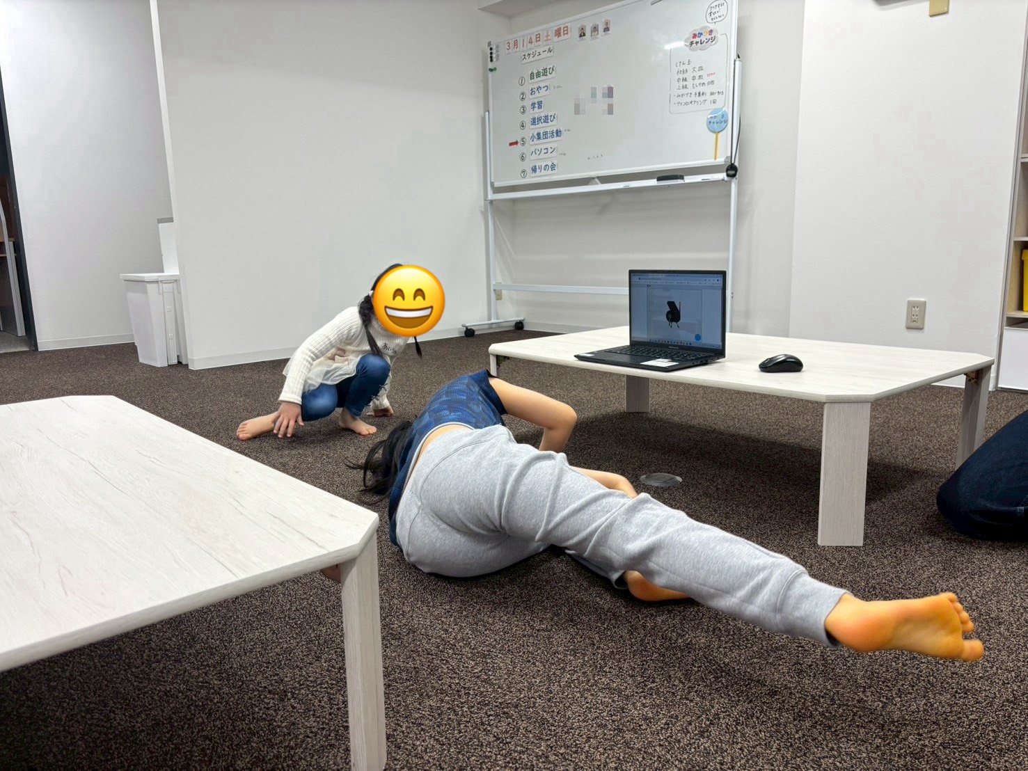 上半身は動かさず足の指を屈伸させる動きでほんの少しずつ前進したり、抜き足差し足で進んだり…普段はついつい動き回りたくなってしまうお子さんも、このときばかりはゆっくりと動くことに意識を向けていました。そのおかげもあり、ホイッスルマンにバレずにパソコンの前を通り抜けることができています!