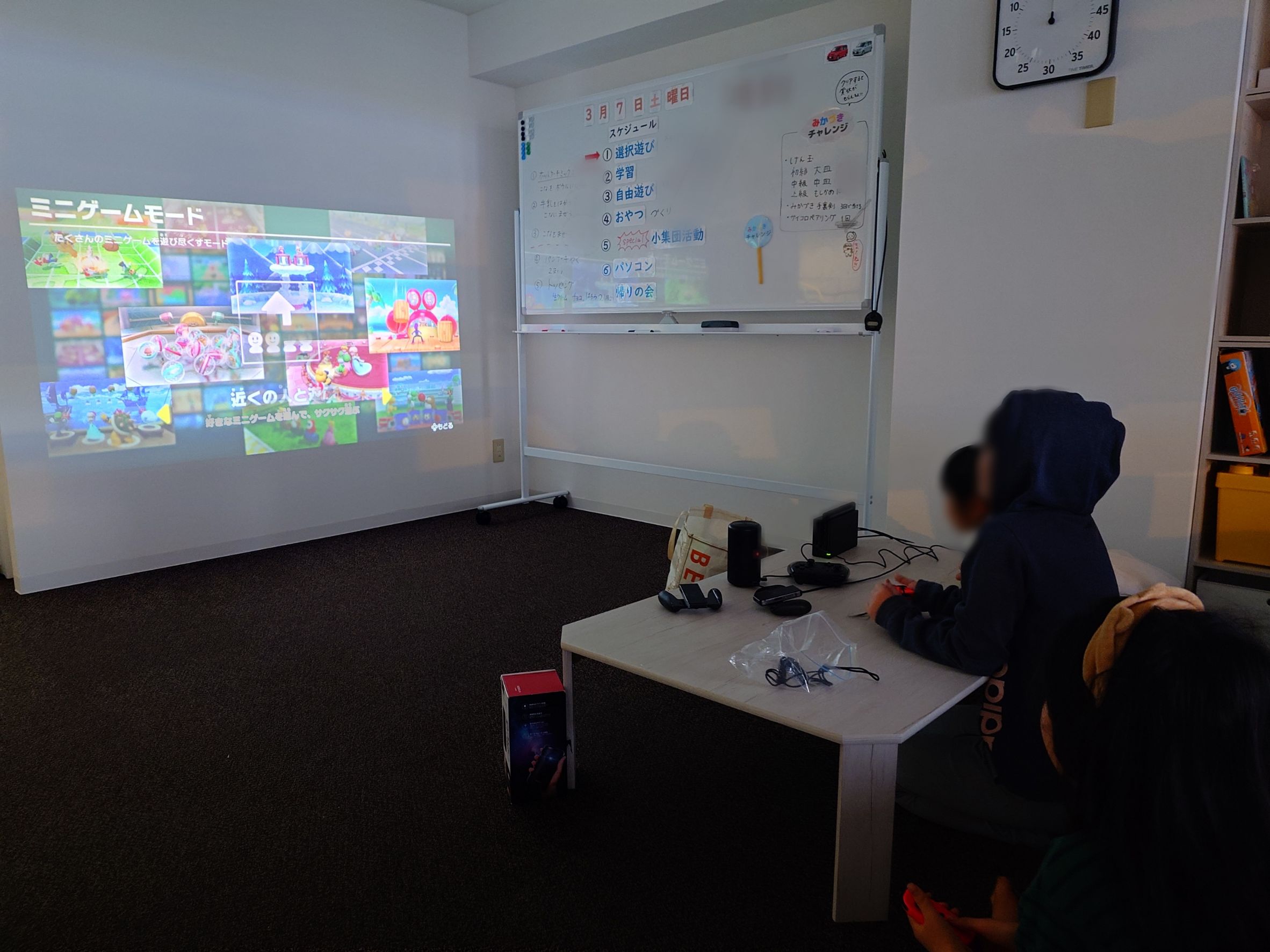 ゲーム画面を映せるテレビがないため、今回は室内を少し暗くしてプロジェクターで壁に投影しています。マリオパーティーなどのゲームでスタッフも一緒に盛り上がりました!