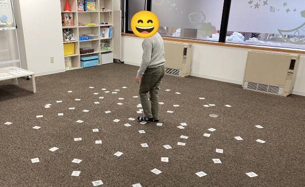 まずはひらがなが書かれたカードを、床いっぱいに広げます。