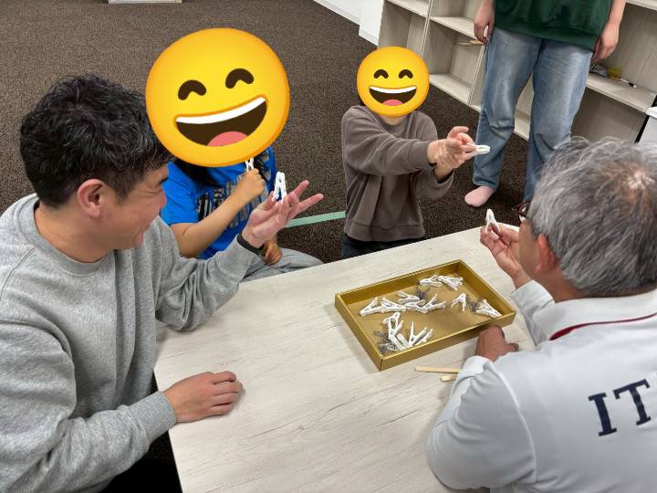 写真は、親指と薬指など指定の指で洗濯バサミを開くチャレンジをしている様子です。薬指や小指は特に力が入りづらいので、みんな必死の形相でした😅