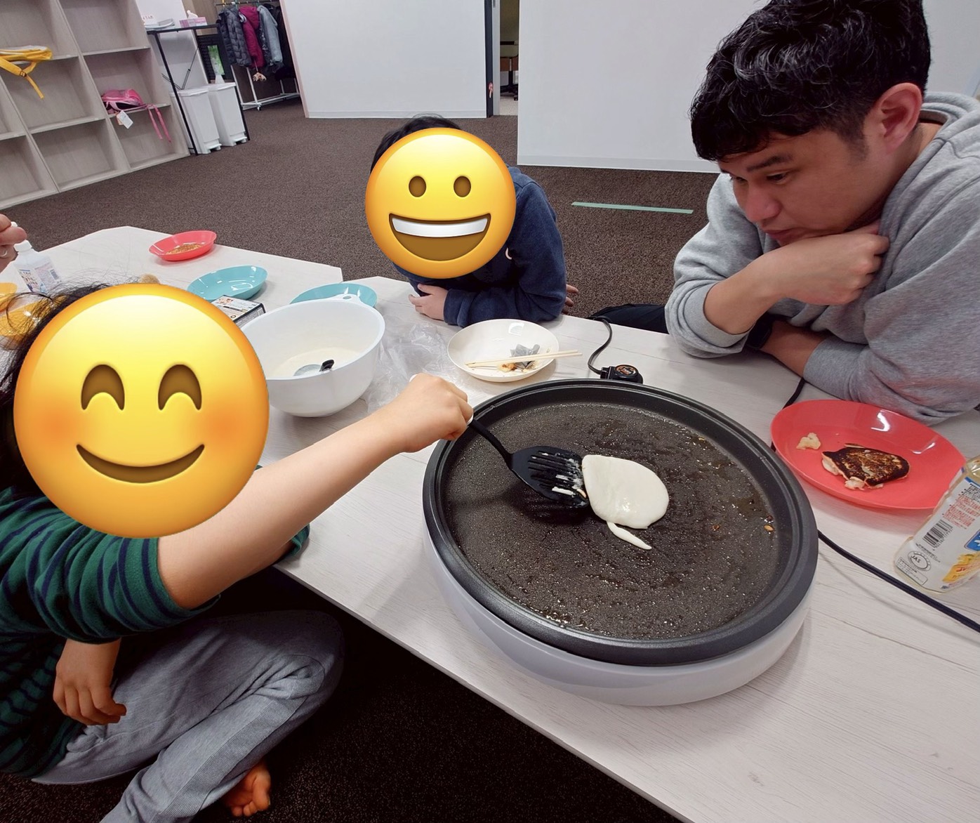 作業をみんなで分担して、協力して作ったパンケーキの生地をホットプレートで焼いていきます。